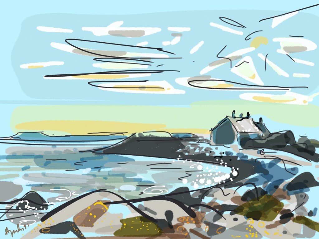 It’s that time of year when I go out painting with my iPad, especially to the coast which is my favourite place to capture. This painting is of Stolford on Bridgwater Bay on a bright sunny day with the light twinkling off the sea water. I find the sea defence here particularly interesting with abundant lichen growing on the rocks and this is where I beachcomb and collect limpet shells. I used PaperbyWeTransfer to paint this.