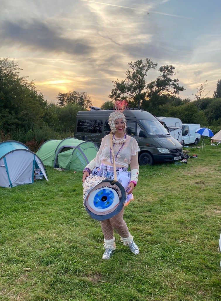 I was very pleased to perform as the Goddess Gaia with the wonderful Hatch artists at Fanny’s Meadow Festival at Martock this weekend. Our wearable art fashion got the sunset spot on Saturday night and our Gods and Goddesses delighted the crowds and really got the party going. More information about the story behind the show can be found at https://hatch-art.weebly.com/ and on the Hatch socials including https://www.instagram.com/hatch_somerset/