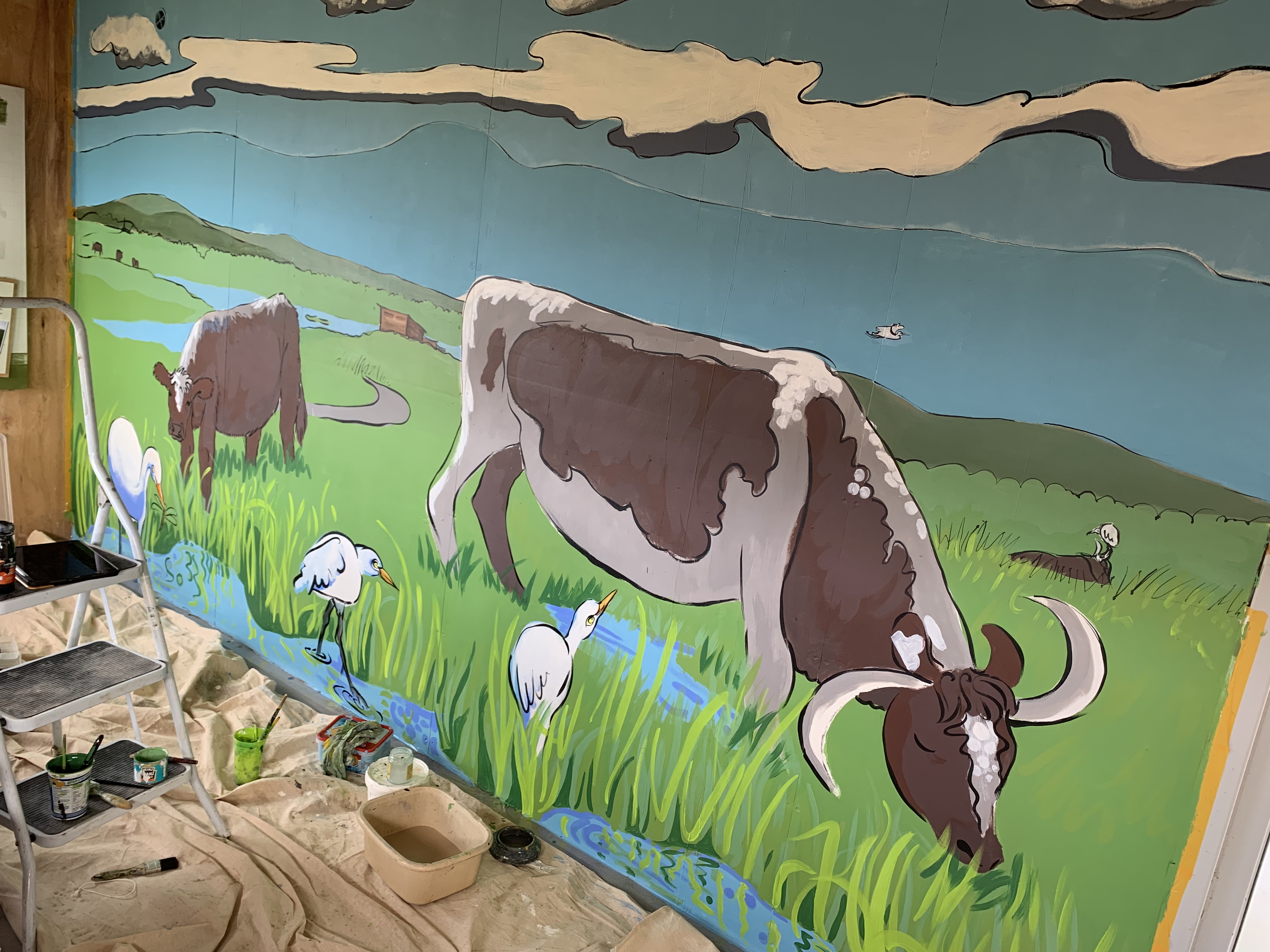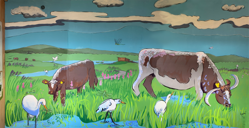 Cows and Egrets are a favourite of mine so when I was asked to paint a mural in the Quantock Hide at WWT Steart I was very pleased. My painting feaures the Old English Longhorn Cattle that you often see at Steart with their wonky horns accompanied by Cattle Egrets who feed side by side with the cows.