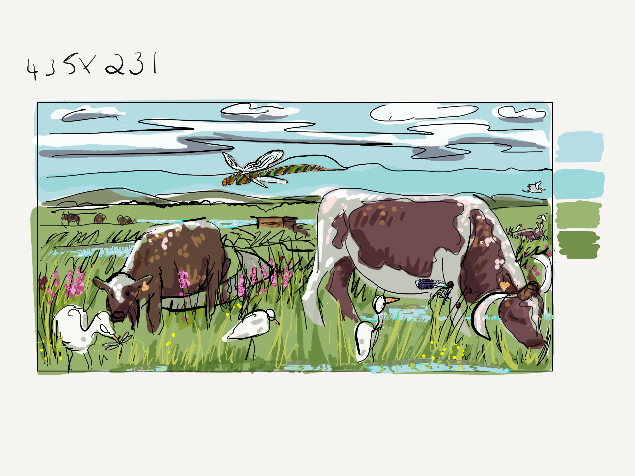 Big thanks as ever for WWT Steart Marshes for this opportunity to work in this beautiful place and thanks to the visitors to Dragonfly day who joined in and had a go at painting with me. I hope all the visitors to the bird hides enjoy my painting and get a chance to see these wonderful cows and birds for real in the reserve.