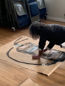 Did you know I also teach individuals? Michelle has been coming to me for several years now, we started off with iPad art lessons over Zoom and now we are tackling big projects with good old messy charcoal. This week Michelle learnt how to draw a freeform abstract piece in response to music and then redrew it huge on the wall, it was bigger than her! Homework involved photographing the piece and carrying on with it at home on her iPad. Michelle had never worked big before and was thrilled with the results.