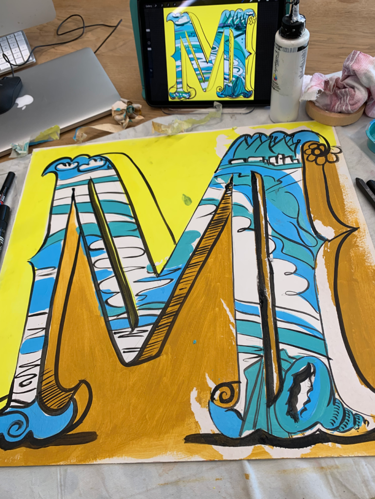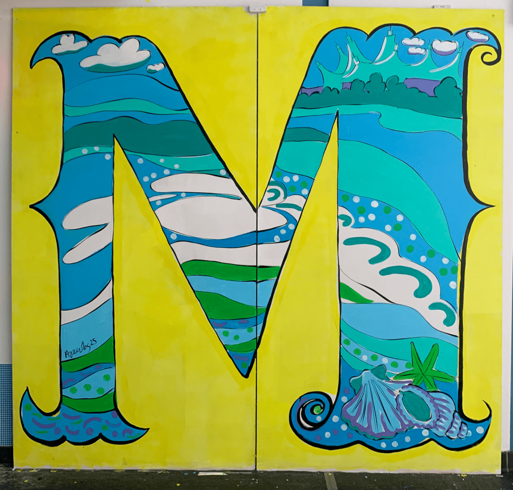 I chose to paint a giant M as bold statement of local pride. I’ve become known for my expressive use of colour and themes rooted in community and environment, so designed the mural as a tribute to the town’s rich cultural and coastal heritage.