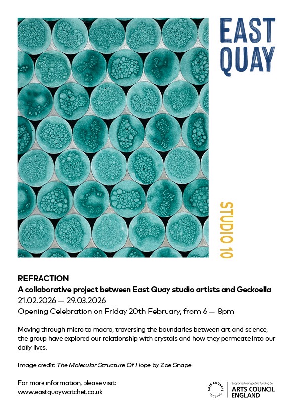 On Friday 20th Feb, we gathered in Studio 10 at East Quay, Watchet, to celebrate the opening of REFRACTION, a collaborative art and science exhibition. This project has been a joy to develop since May 2025, representing a unique contemporary art residency. The show features a diverse group of East Quay artists including Melanie Deegan, Amanda Shears, Georgina Towler, Vanessa Clegg, Sarah Ward, Sue Lowe, Zoe Snape, and myself – working alongside the environmental consultancy Geckoella.