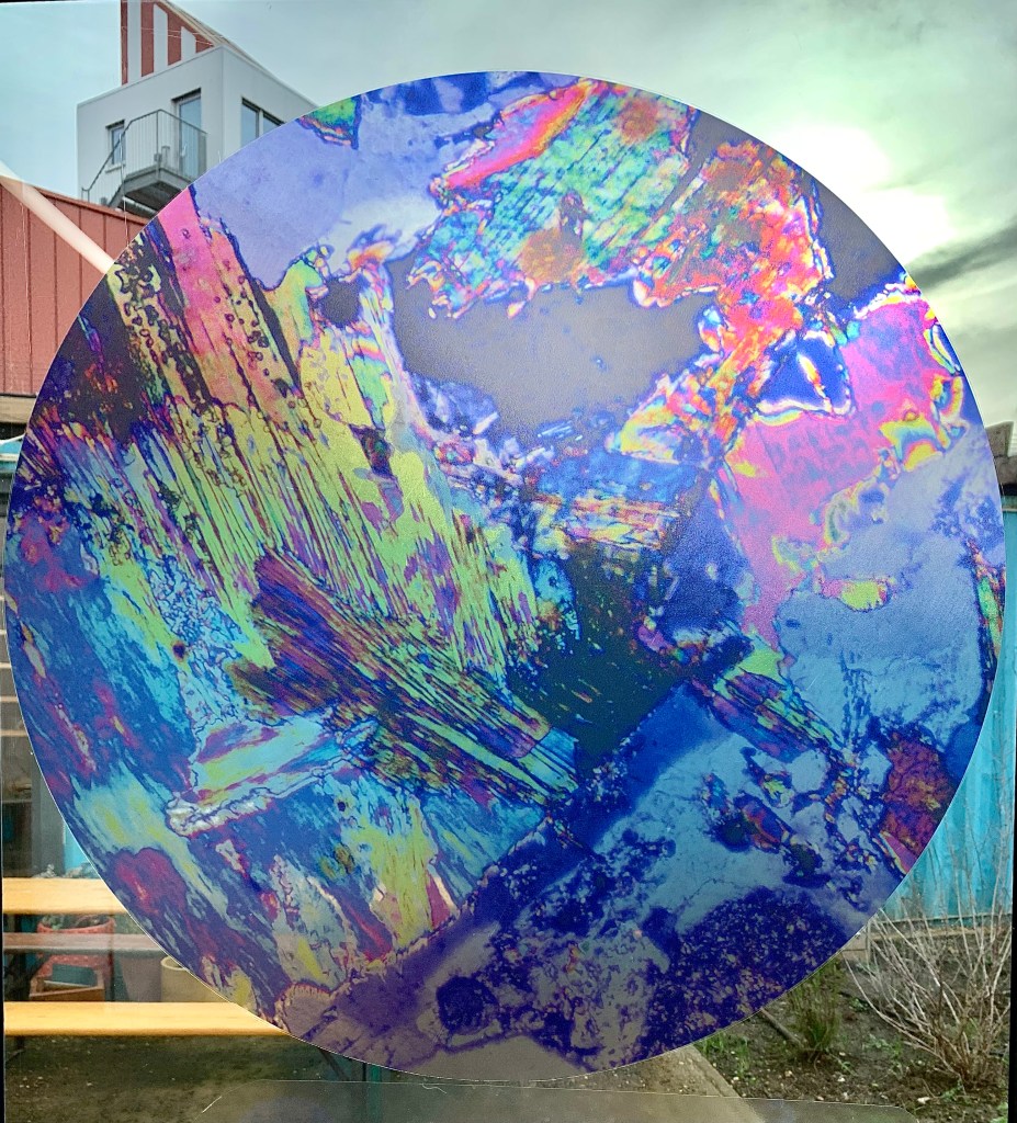 For the smaller entrance window, I developed Jamie’s petrographic microscope photography of rock thin sections into luminous window vinyl installations. When illuminated from within after dark, these microscopic rock sections look like distant galaxies, revealing the architectural scale of mineralogy that is usually hidden from the naked eye. These thin sections in geology are essential tools for building stone investigations, but here, they become high-concept art.