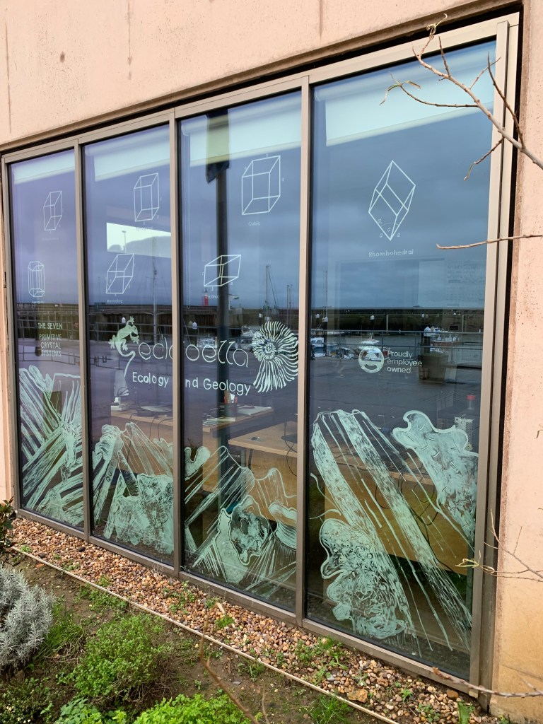 The larger window now features a design of The Seven Primitive Crystal Systems, which appears to float above a Gabbro thin section image. This was conceived by geologist Jamie Foster and brought to life by ecologists Mireya García Tamayo and Allison Clarke under my guidance.