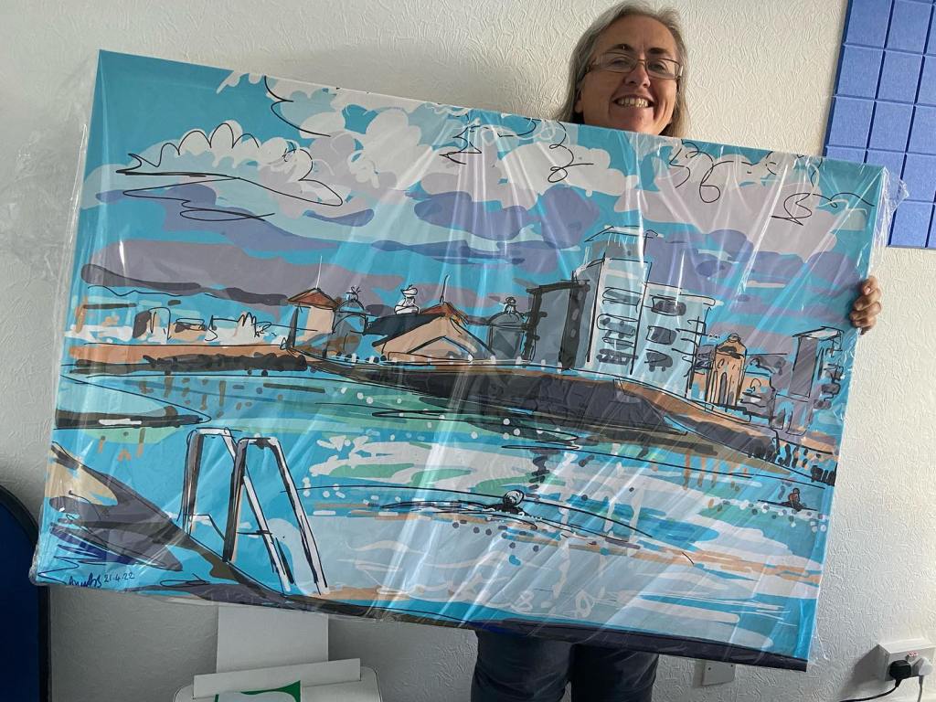 When Pippa from C3 Communications contacted me to get this painting of her business partner Saranne swimming, I was delighted to prepare it for printing onto canvas. It was an exciting time for them launching their new business, you can see how pleased Saranne was to receive the gift. Can’t wait to see it unwrapped and hung on their office wall.